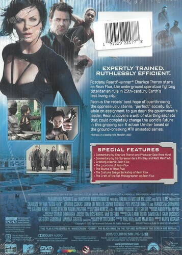 Charlize Theron is sexy assassin Aeon Flux in this thrilling sci-fi actioner based on the MTV animated series. In the 25th century, the only survivors of a devastating plague are confined to a sterile, walled city. Sent by a band of rebels to kill the city's despotic ruler (Martin Csokas), Theron is haunted by memories that suggest a link between her and her target. Jonny Lee Miller, Sophie Okonedo, Pete Postlethwaite, Frances McDormand co-star. 92 min. Widescreen (Enhanced); Soundtracks: English Dolby Digital 5.1, Dolby Digital stereo Surround, French Dolby Digital 5.1; Subtitles: English, Spanish; audio commentary; featurettes; theatrical trailer.