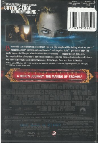 The Old English epic poem is brought to magical life through the use of state-of-the-art motion capture and computer animation. His kingdom threatened by the troll Grendel, Danish King Hrothgar summons the famed warrior Beowulf, who must do battle against the evil monster before facing Grendel's vengeful mother and, finally, a fierce dragon. Ray Winstone, Anthony Hopkins, Angelina Jolie, Robin Wright Penn, John Malkovich lend their likenesses and voices to this gripping saga. 114 min. Widescreen (Enhanced); Soundtracks: English Dolby Digital 5.1, French Dolby Digital 5.1, Spanish Dolby Digital 5.1; Subtitles: English, French, Spanish; "making of" documentary.