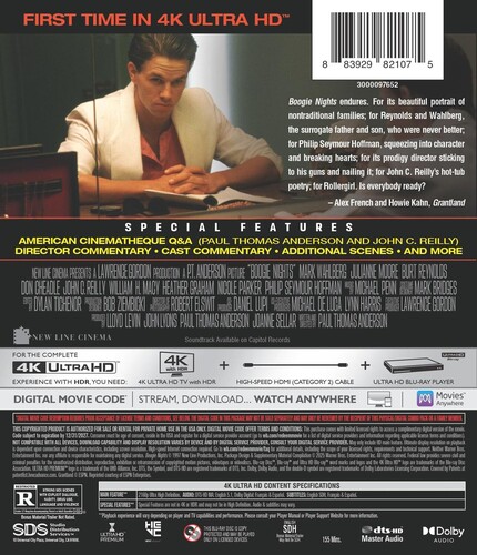 Writer/director Paul Thomas Anderson spun cinematic dross into gold with his acclaimed, disco-filled chronicle of the adult film industry's rise and decline in the late '70s and early '80s. Mark Wahlberg is well-endowed busboy-turned-screen superstud "Dirk Diggler," who becomes part of a close-knit Southern California family of performers and filmmakers. They include auteur-minded director Burt Reynolds, leading lady Julianne Moore, and starlet Heather Graham. 155 min. Widescreen; Soundtrack: English.