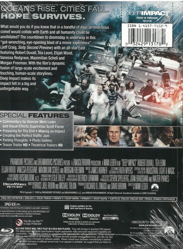 This special-effects-filled disaster epic stars Téa Leoni as a TV reporter who uncovers the suppressed news that a newly discovered comet is on a collision course with Earth. With time running out, a NASA team led by a veteran astronaut (Robert Duvall) is sent to try and destroy the comet, while a lottery is held to pick the million Americans to be housed in specially built caves to survive the coming catastrophe. Morgan Freeman, Elijah Wood, Maximilian Schell also star. 121 min. Widescreen; Soundtracks: English Dolby TrueHD 5.1, French Dolby Digital 5.1, Spanish Dolby Digital 5.1; Subtitles: English (SDH), French, Portuguese, Spanish; audio commentary; featurettes; photo gallery; theatrical trailers.
