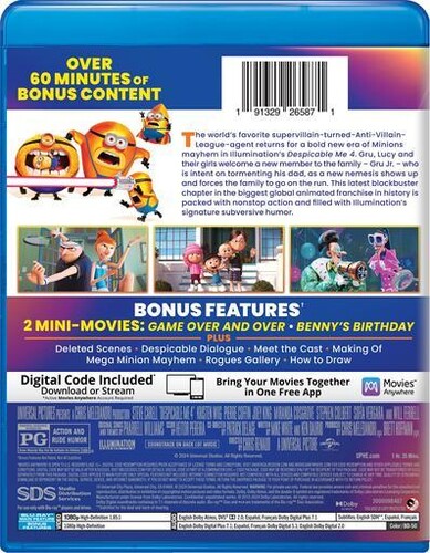 The good news for ex-supervillain Gru (voiced by Steve Carell) was that he and Lucy (Kristen Wiig) had welcomed infant son Gru, Jr. to their blended clan. The bad news was that the vengeance threats of escaped onetime rival Maxime Le Mal (Will Ferrell) forced the entire family into witness protection--and Gru's about to find that posing as a regular suburban dad is tougher than world-conquering. Also with the voices of Sofia Vergara, Joey King, Stephen Colbert, Chloe Fineman, and Pierre Coffin as the Minions. 95 min. Widescreen; Soundtrack: English.