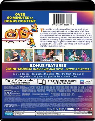 The good news for ex-supervillain Gru (voiced by Steve Carell) was that he and Lucy (Kristen Wiig) had welcomed infant son Gru, Jr. to their blended clan. The bad news was that the vengeance threats of escaped onetime rival Maxime Le Mal (Will Ferrell) forced the entire family into witness protection--and Gru's about to find that posing as a regular suburban dad is tougher than world-conquering. Also with the voices of Sofia Vergara, Joey King, Stephen Colbert, Chloe Fineman, and Pierre Coffin as the Minions. 95 min. Widescreen; Soundtrack: English. Two-disc set.