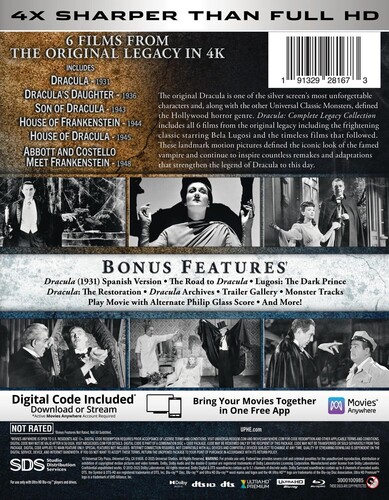 The original Dracula is one of the silver screen's most unforgettable characters and, along with the other Universal Classic Monsters, defined the Hollywood horror genre. Dracula: Complete Legacy Collection includes all 6 films from the original legacy including the frightening classic starring Bela Lugosi and the timeless films that followed. These landmark motion pictures defined the iconic look of the famed vampire and continue to inspire countless remakes and adaptations that strengthen the legend of Dracula to this day.