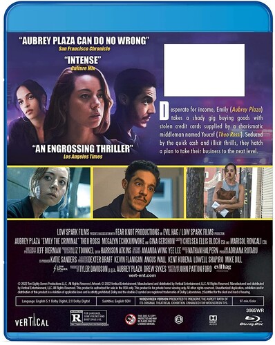 Jersey art school grad Emily Benetto (Aubrey Plaza) came to L.A. with $70K in college debt and an assault on her record. Against the odds, she found a way to make ends meet-by falling in with a credit card fraud ring, making big-ticket purchases on stolen plastic and reselling the merchandise. As she cozies up to her "supervisor" (Theo Rossi), she'll find out it's a gig where you kind of can't give your notice. Intense study also stars Gina Gershon, Megalyn Echikunwoke, Bernardo Badillo.