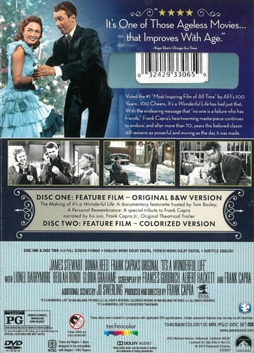 Frank Capra’s perennial holiday classic is one of the most beloved films of all time and the quintessential "Capraesque" comedy/drama. James Stewart is Bedford Falls banker George Bailey, who is driven by circumstances one Christmas Eve to consider suicide, only to be shown by neophyte angel Clarence Odbody (Henry Travers) what a difference his life has made. Tremendous supporting cast includes Donna Reed, Thomas Mitchell, Lionel Barrymore, Ward Bond, Beulah Bondi. Includes both the original B&W and newly colorized versions. 130 min. Standard; Soundtracks: English Dolby Digital mono, French Dolby Digital mono; Subtitles: English; featurette; theatrical trailers. Two-disc set.