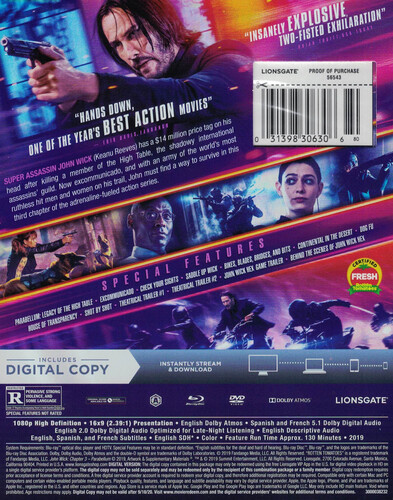 John Wick (Keanu Reeves) has really done it this time. After killing a member of the international criminal council known as the High Table, pro hit man Wick winds up with a $14 million bounty on his head. Can he evade yet another batch of dangerous killers as he travels all the way to the Moroccan desert in an effort to find the one member of the High Table who can commute his sentence? Halle Berry, Ian McShane, Laurence Fishburne also star in the action-packed third entry in the popular franchise. 131 min. Widescreen; Soundtrack: English. Two-disc set.