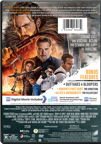 Sergei Kravinoff (Aaron Taylor-Johnson) knew tough love from his Russian crimelord father Nikolai (Russell Crowe)--to the point of being dragged on a Ghana safari as a teen, where he only survived a lion mauling through a local witch doctor's potion. Now using the animal abilities he gained to hunt those the system can't touch, he's forced to aid Nikolai against the takeover plans of the Rhino (Alessandro Nivola). Screen bow for the Spider-Man rogue co-stars Ariana DeBose, Fred Hechinger, Christopher Abbott. 127 min. Widescreen; Soundtrack: English.