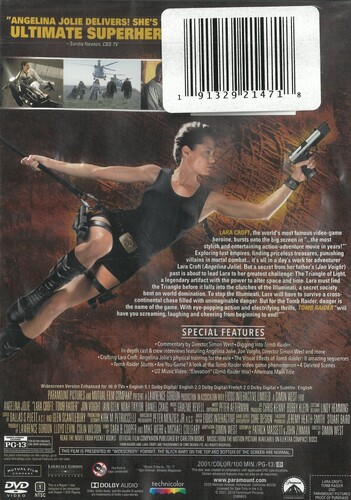 The voluptuous video game heroine busts onto the big screen in this action-packed odyssey with Angelina Jolie as aristocratic adventurer Lara Croft, equally adept at collecting ancient artifacts and hand-to-hand combat. Here Lara has to keep a pair of mystical talismans from the Illuminati, a secret society who will use the artifacts to gain control of time and space. Iain Glen, Daniel Craig and Jon Voight also star. 100 min. Widescreen (Enhanced); Soundtracks: English Dolby Digital 5.1, Dolby Digital Surround, French Dolby Digital Surround; Subtitles: English; audio commentary; deleted scenes; "making of" featurettes; theatrical trailer; music video; DVD-ROM content; scene access.