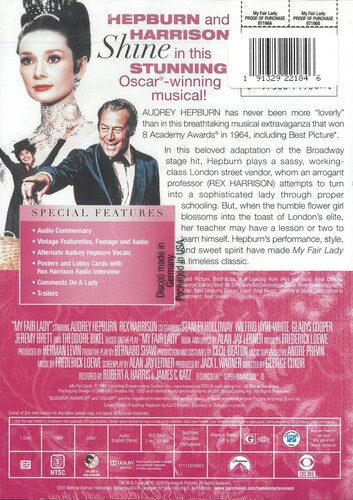 George Bernard Shaw's play "Pygmalion," about the wondrous transformation of Cockney flower girl Eliza Doolittle (Audrey Hepburn) into a refined woman of society by linguist Henry Higgins (Rex Harrison), was combined with such unforgettable Lerner and Loewe songs as "I Could Have Danced All Night," "On the Street Where You Live," and "Wouldn't It Be Loverly," and the result was this winner of eight Academy Awards, including Best Picture. Co-stars Wilfrid Hyde-White, Stanley Holloway. 172 min. Widescreen (Enhanced); Soundtrack: English Dolby Digital stereo; audio commentary; featurettes; Hepburn vocal performances; poster gallery; interview; theatrical trailer.