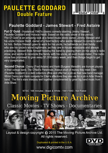 Paulette Goddard Double Feature - Pot O'Gold - Hysterical 1940's classic comedy starring Jimmy Stewart, Paulette Goddard and Horace Heidt. Based on the radio show of the period, 'Pot O' Gold' is an amusing look at a failed music store owner, Jimmy Stewart and his uncle Horace Heidt, owner of a food factory who wants Stewart to come to work for him. Before Stewart goes to work for his uncle, he befriends an Irish family who are his uncle's worst nightmare, as they are in-house musicians and always practicing. Stewart finds himself helping the band by placing them on his uncle's radio show, and works to reconcile the family with his uncle, an avid music-hater. The radio show has promised to give away $1,000 every week, and then things begin to get very complicated. Second Chorus (1940) - Danny (Fred Astaire) and Hank (Burgess Meredith) are trumpet players in their college band, The O'Neill's Perennials. Always short of money they meet Ellen (Paulette Goddard) in a debt collectors office and offer her a job as their new band manager. Whilst Danny and Hank compete for Ellen's affections they also vie for a job in Artie Shaw's band. The film's stars interplay well together complimented by great big band music from Artie Shaw. (166 minutes - 1941/1940 - Black & White - 4:3)