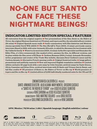 - 4K restoration from the original negative for Santo vs. the Riders of Terror and the alternative softcore version, Lepers and Sex