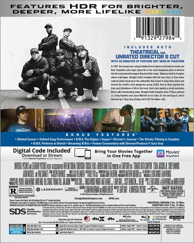 In the late-'80s streets of Southern California, a group of young rappers and DJs started crafting hip-hop with a hard edge unheard in the East...and they'd ultimately change the course of the American music industry. The rise and split of N.W.A.--and the bonds and tensions between founders Ice Cube (O'Shea Jackson, Jr.), Dr. Dre (Corey Hawkins), and Eazy-E (Jason Mitchell)--are unforgettably explored in this comprehensive biopic; Neil Brown, Jr., Aldis Hodge, Paul Giamatti also star. R-rated version; 147 min./Director’s cut; 167-min. Widescreen; Soundtrack: English. Two-disc set.