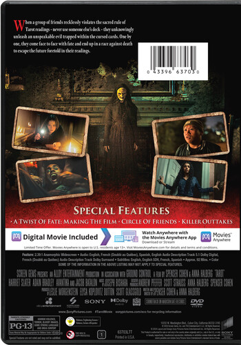 When a klatch of college friends started rummaging in the basement of their rental house, they should have left the strange old tarot deck where they'd found it. Instead, the reading they held turned out to be more than a time-killer--as living embodiments of the cards' symbols started knocking them off one by one. Shudder-packed take on the YA novel "Horrorscope" stars Harriet Slater, Jacob Batalon, Avantika, Humberly González, Larsen Thompson, Adain Bradley, Wolfgang Novogratz. 92 min. Widescreen; Soundtrack: English.