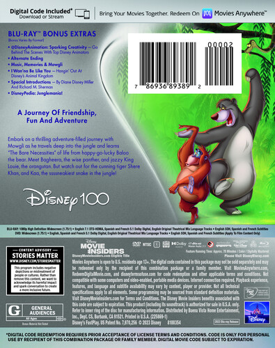 The last cartoon feature overseen by Walt Disney himself, this animated adaptation of Rudyard Kipling’s 1894 classic follows young "man-cub" Mowgli and his animal mentors, Baloo (voiced by Phil Harris) the bear and Bagheera (Sebastian Cabot) the panther, in the Indian jungle. With the imminent arrival of the man-eating tiger, Shere Khan (George Sanders), Mowgli’s friends try to convince him to return to his own kind in the "Man-Village." Other voices by Bruce Reitherman, Sterling Holloway. Songs include "The Bare Necessities" and "I Wanna Be Like You." 78 min. Widescreen (Enhanced); Soundtrack: English