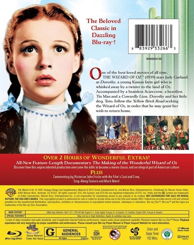 Follow Dorothy over the rainbow and down the Yellow Brick Road in one of the most beloved films in cinematic history. Not in Kansas anymore after a tornado whisks her away to the Land of Oz, Dorothy is off for adventure in the Emerald City with the Scarecrow, the Tin Woodsman, the Cowardly Lion, and Toto, too, all the while being chased by the Wicked Witch of the West and looking for a way home. Judy Garland, Ray Bolger, Jack Haley, Bert Lahr, Margaret Hamilton, and Frank Morgan star. 102 min. Standard; Soundtracks: English DTS HD 5.1 Master Audio, French Dolby Digital 5.1, Spanish Dolby Digital mono; Subtitles: English (SDH), French, Spanish; audio commentary; "making of" documentary; sing-along songs.