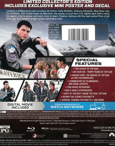 Tom Cruise is Maverick; ace Navy fighter pilot, member of elite "Top Gun" school with fellow fliers Iceman (Val Kilmer) and Goose (Anthony Edwards); goes against the rules and riles his boss (Tom Skerritt); falls for teacher Charlie (Kelly McGillis); wants to fly his way; exciting dogfight finale; blazing jets; beach volleyball; lots of rock 'n' roll. Co-stars Michael Ironside, John Stockwell, Tim Robbins; directed by Tony Scott. 109 min. Widescreen; Soundtracks: English Dolby Atmos, Dolby Digital 5.1, French, Portuguese, Spanish; Subtitles: English (SDH), French, Portuguese, Spanish; audio commentary; featurettes; TV spots; music videos.