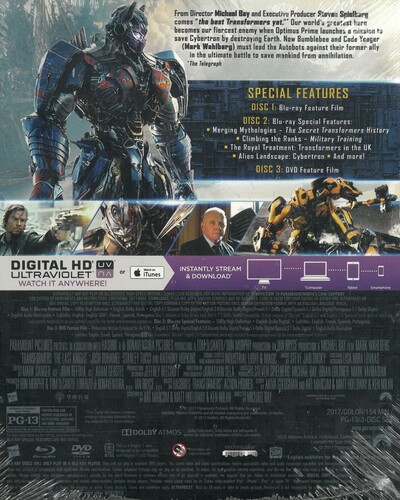In the fifth chapter in director Michael Bay’s hit sci-fi saga based on the enduring toy line, Autobot leader Optimus Prime is on a crusade to save the Transformers’ home planet of Cybertron...by destroying Earth. Armed with an artifact that dates back to the time of King Arthur, can the combined forces of humans and Autobots save the world, turn Prime back to the good side, and defeat a reborn Megatron and his Decepticons? Mark Wahlberg, Josh Duhamel, Laura Haddock, Anthony Hopkins star. 149 min. Widescreen; Soundtrack: English. Three-disc set.