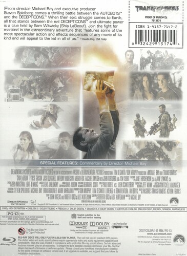 The popular "robots in disguise" of cartoon and toy fame hit the big screen in this explosive actioner directed by Michael Bay. When teenager Sam (Shia LaBeouf) buys a car that turns out to be one of the transforming robots, he becomes embroiled in the centuries-long war between the heroic Autobots and the evil Decepticons. Now he must help Autobot leader Optimus Prime prevent a powerful and mystical device from falling into the hands of arch-nemesis Megatron. With Megan Fox, Josh Duhamel, Jon Voigt, and John Turturro. 143 min. Widescreen; Soundtracks: English Dolby TrueHD 5.1, French Dolby Digital 5.1, Spanish Dolby Digital 5.1; Subtitles: English (SDH), French, Portuguese, Spanish; audio commentary; more.