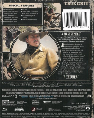 Joel and Ethan Coen's filming of the Charles Portis frontier novel follows no-nonsense 14-year-old Mattie Ross (Hailee Steinfeld) as she seeks the outlaw who gunned down her father. Joining Mattie on her perilous quest--for duty, or for the reward money, or both--are hard-drinking, one-eyed marshal Rooster Cogburn (Jeff Bridges) and a Texas Ranger named LaBoeuf (Matt Damon). Josh Brolin, Barry Pepper also star. 110 min. Widescreen; Soundtracks: English Dolby Digital 5.1, French Dolby Digital 5.1, Spanish Dolby Digital 5.1; Subtitles: English, French, Spanish; featurettes; theatrical trailer.