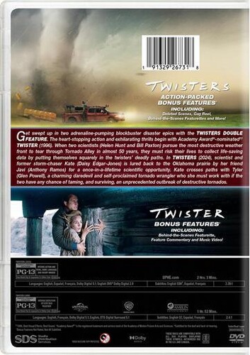 Get swept up in two adrenaline-pumping blockbuster disaster epics with the Twisters Double Feature. The heart-stopping action and exhilarating thrills begin with Academy Award®-nominated Twister (1996). When two scientists (Helen Hunt and Bill Paxton) pursue the most destructive weather front to tear through Tornado Alley in almost 50 years, they must risk their lives to collect life-saving data by putting themselves squarely in the twisters' deadly paths. In Twisters (2024), scientist and former storm-chaser Kate (Daisy Edgar-Jones) is lured back to the Oklahoma prairie by her friend Javi (Anthony Ramos) for a once-in-a-lifetime scientific opportunity. Kate crosses paths with Tyler (Glen Powell), a charming daredevil and self-proclaimed tornado wrangler who she must work with if the two have any chance of taming, and surviving, an unprecedented outbreak of destructive tornados.